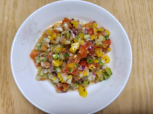 - 토마토: 잘 익은 하지만 무르지 않은 토마토, 너무 딱딱하면 맛이 없고 너무 부드러우면 잘게 썰었을 때 묽어 진다. 썰면서 씨 부분을 좀 제거하는 것이 오래 먹기 좋다.