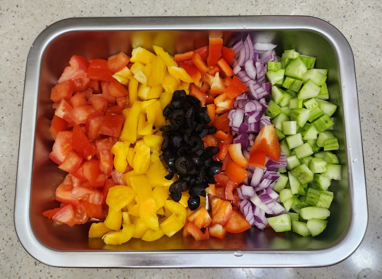 1. 재료 손질: 토마토, 오이, 양파를 작은 크기로 깍둑썰기한다