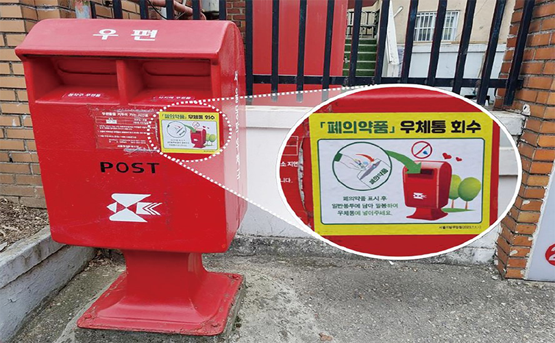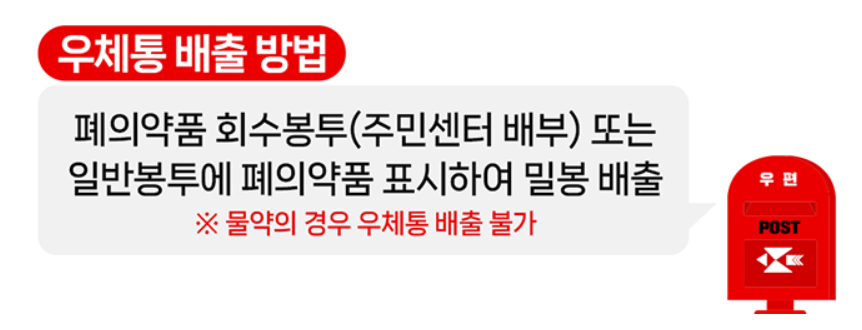 - 우체통 배출 : 물약을 제외한 폐의약품을 표시하여 우체통에 배출하면, 우체국에서 구청으로 배송 후 소각 처리