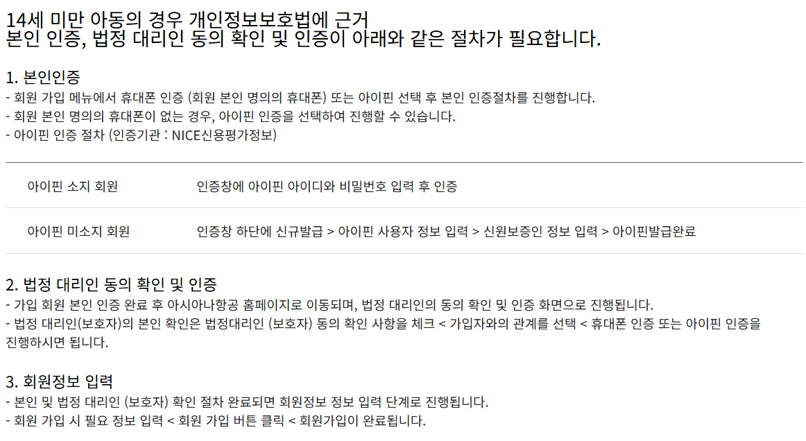 14세 미만이어도 본인명의 스마트폰이 있다면 상관없겠지만, 본인명의 스마트폰이 없고, 아시아나 및 스타얼라이언스 제휴 마일리지 적립을 하려는 경우 어린이 본인 I-PIN을 발급받아 가입하는 것이 필요하다.