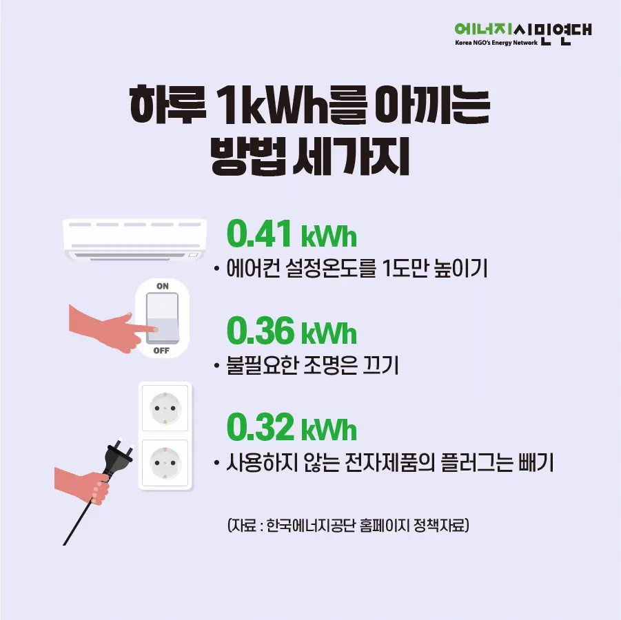 그런데 에어컨 온도 1도만 높이고, 사용하지 않는 전등 끄고, 불필요한 플러그를 뽑는 것 만 실천해도 전기 1kWh를 줄일 수 있다고 한다. 생각보다 어려운 일은 아니다. 우리집 에어컨 설정온는 26도 아래로 내려간 적이 없지만 다양한 가전들을 자주 사용하는 것은 사실이라. 이참에 덜 쓰기를 한 번 해 보기로 했다. 에너지도 절약하고, 전기요금도 줄여보자.