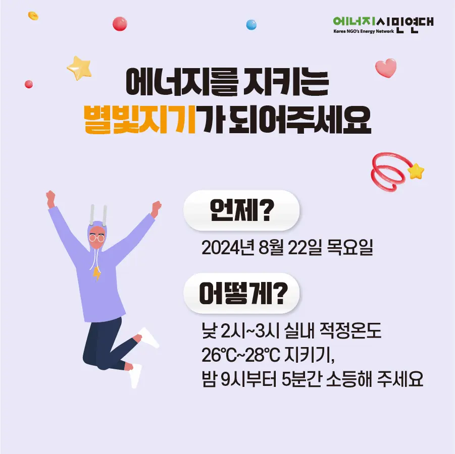 그리고 8월 22일 당일, 오후 2~3시 에어컨 설정 온도를 2도 올리고, 저녁 9시 부터 5분 동안 불을 끄면 된다.